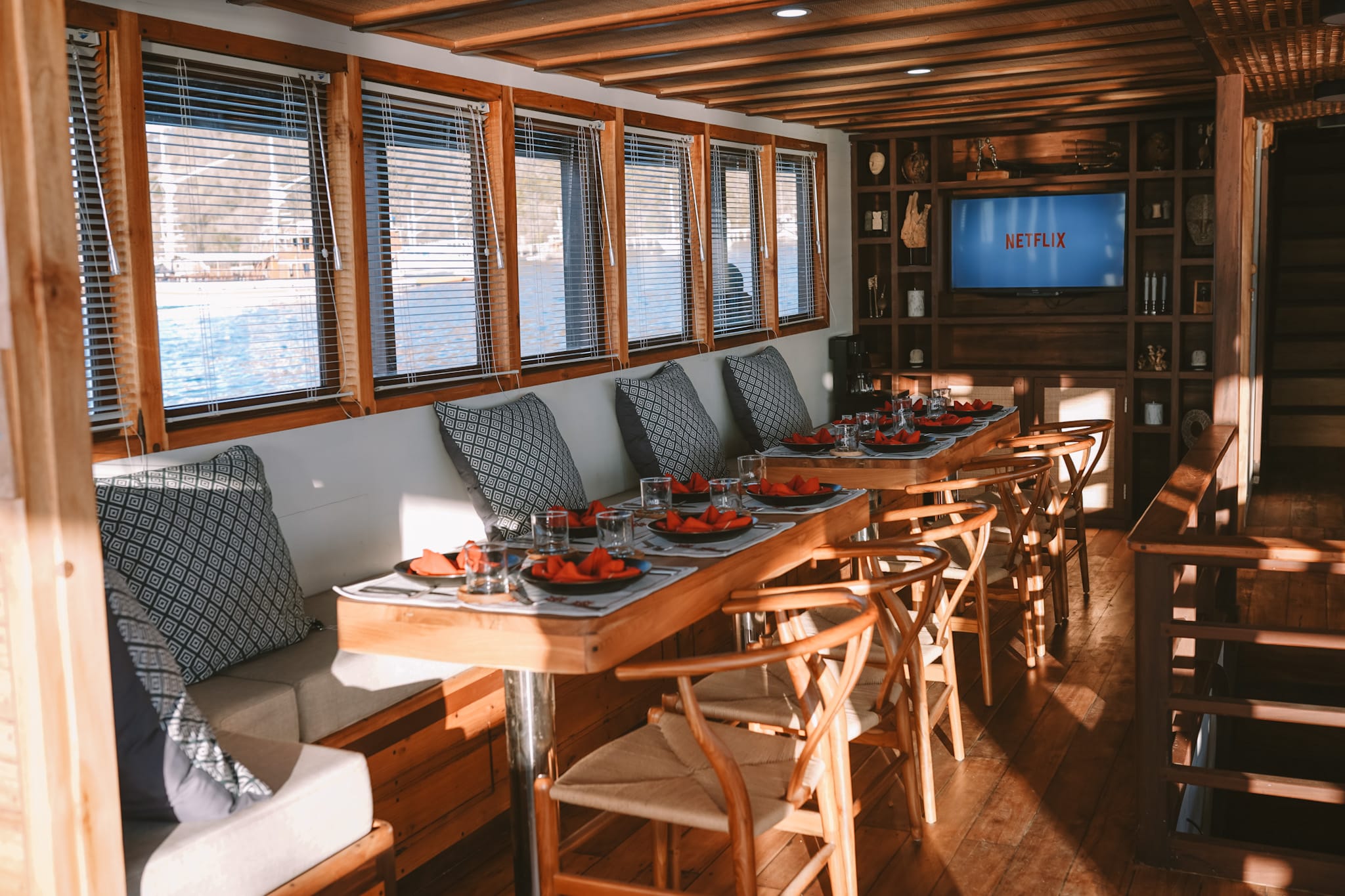 Designed with space, privacy, and comfort in mind, Elbark features nine generous cabins spread across three decks. Guests can relax in a cozy indoor lounge and dining area, unwind on the spacious sky deck, or enjoy sunbathing areas on the main and upper decks. With multiple inviting lounge spaces throughout the vessel, Elbark offers the perfect balance between social moments and quiet escape at sea.